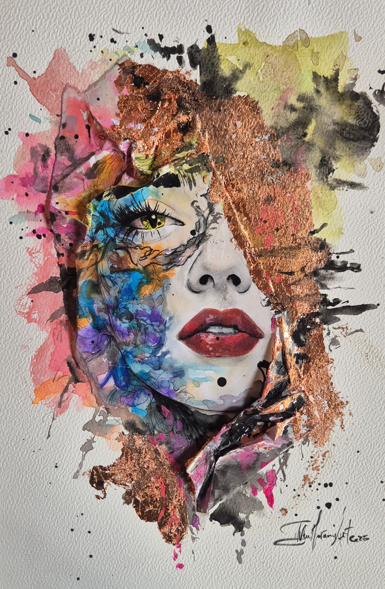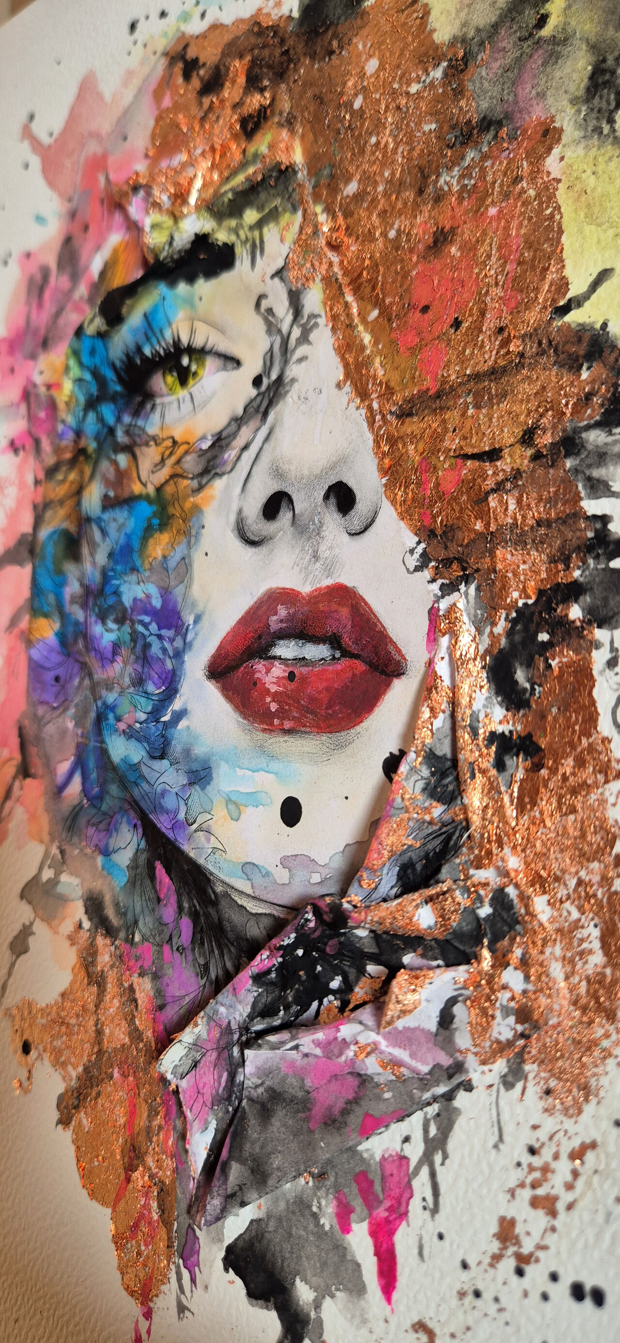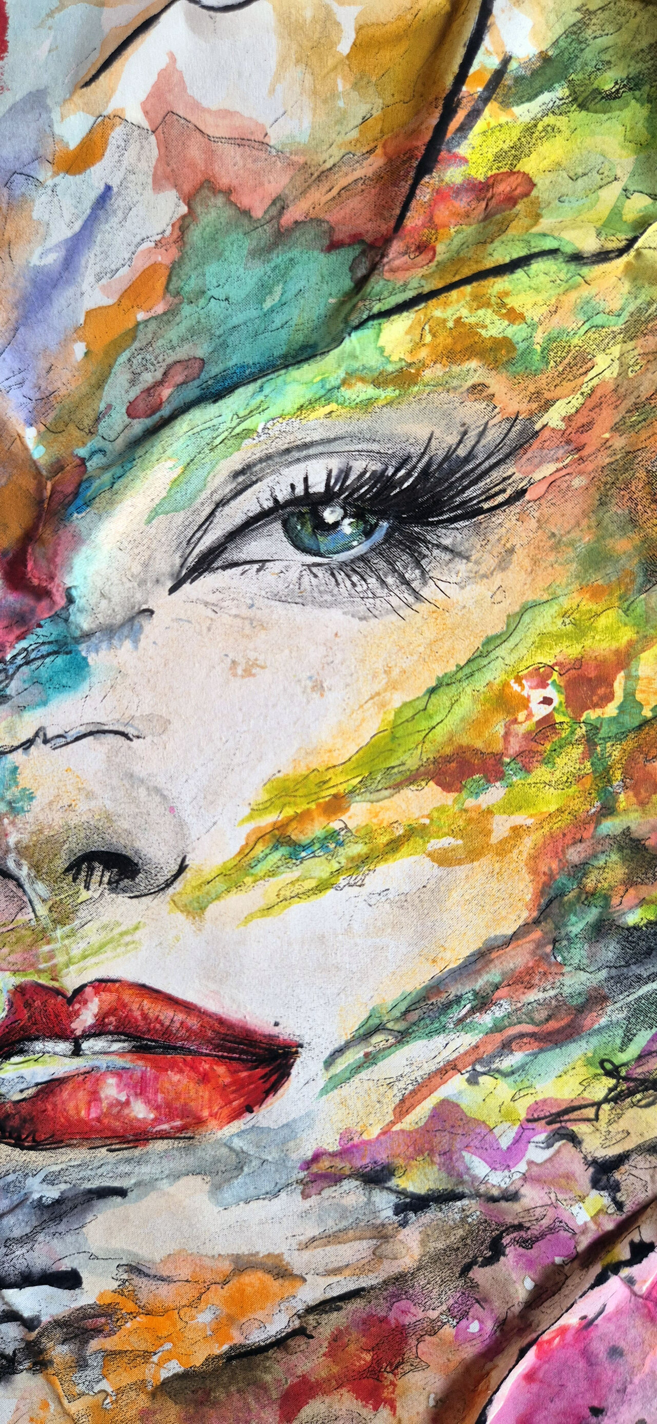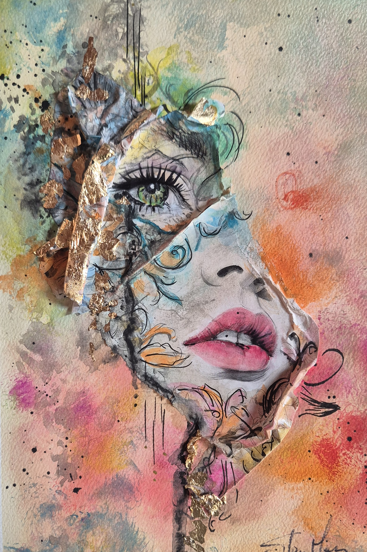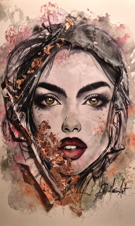 Contorni del volto, soprattutto occhi, sopracciglia e labbra, definiti con linee nette con inchiostri e fineliner che danno struttura e carattere al volto, creando un contrasto forte con le parti più morbide. Effetti tridimensionali, quasi scultorei, che catturano la luce. Pennellate libere, gestuali, lasciate volutamente “aperte”, come se il colore respirasse intorno al volto.