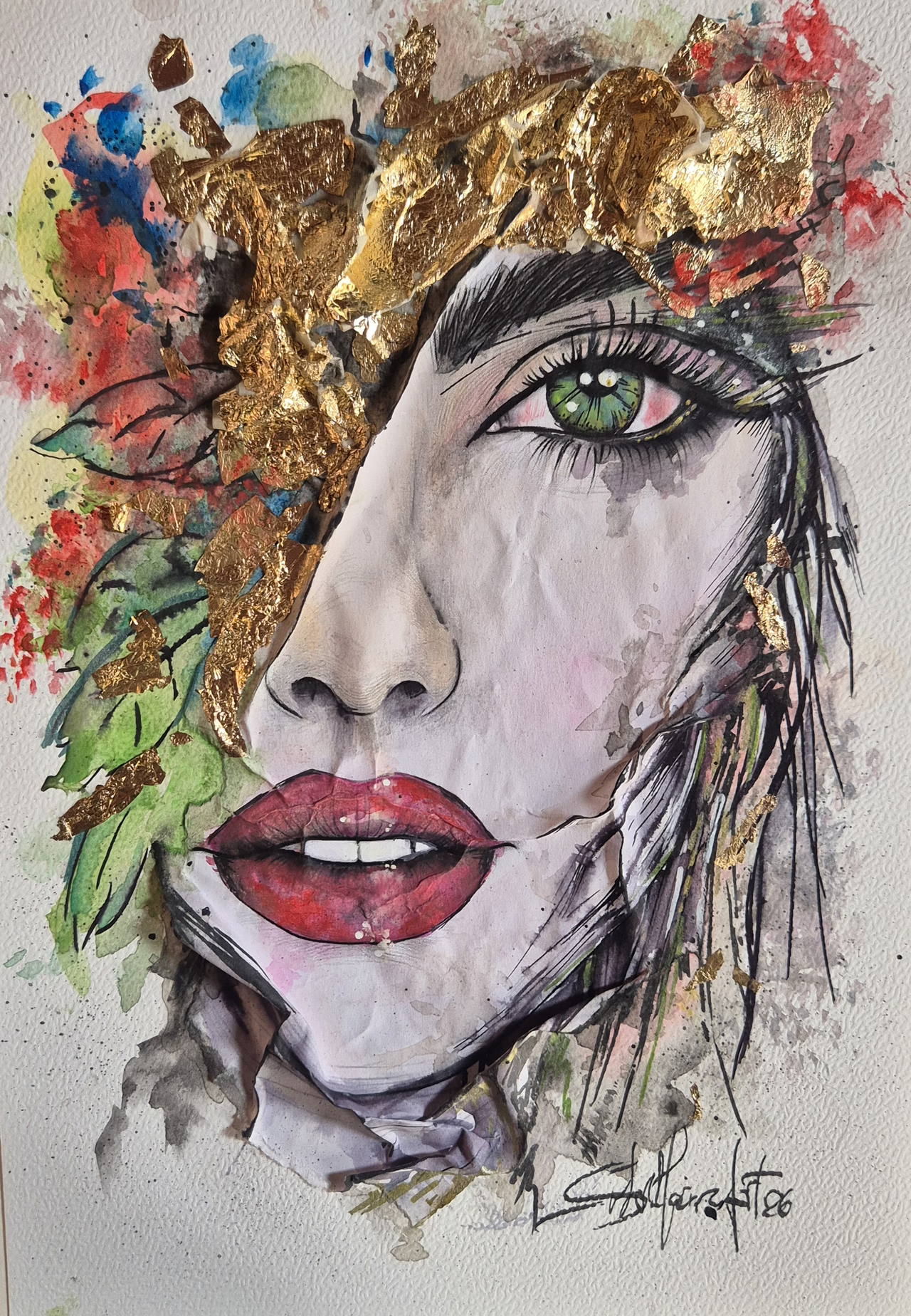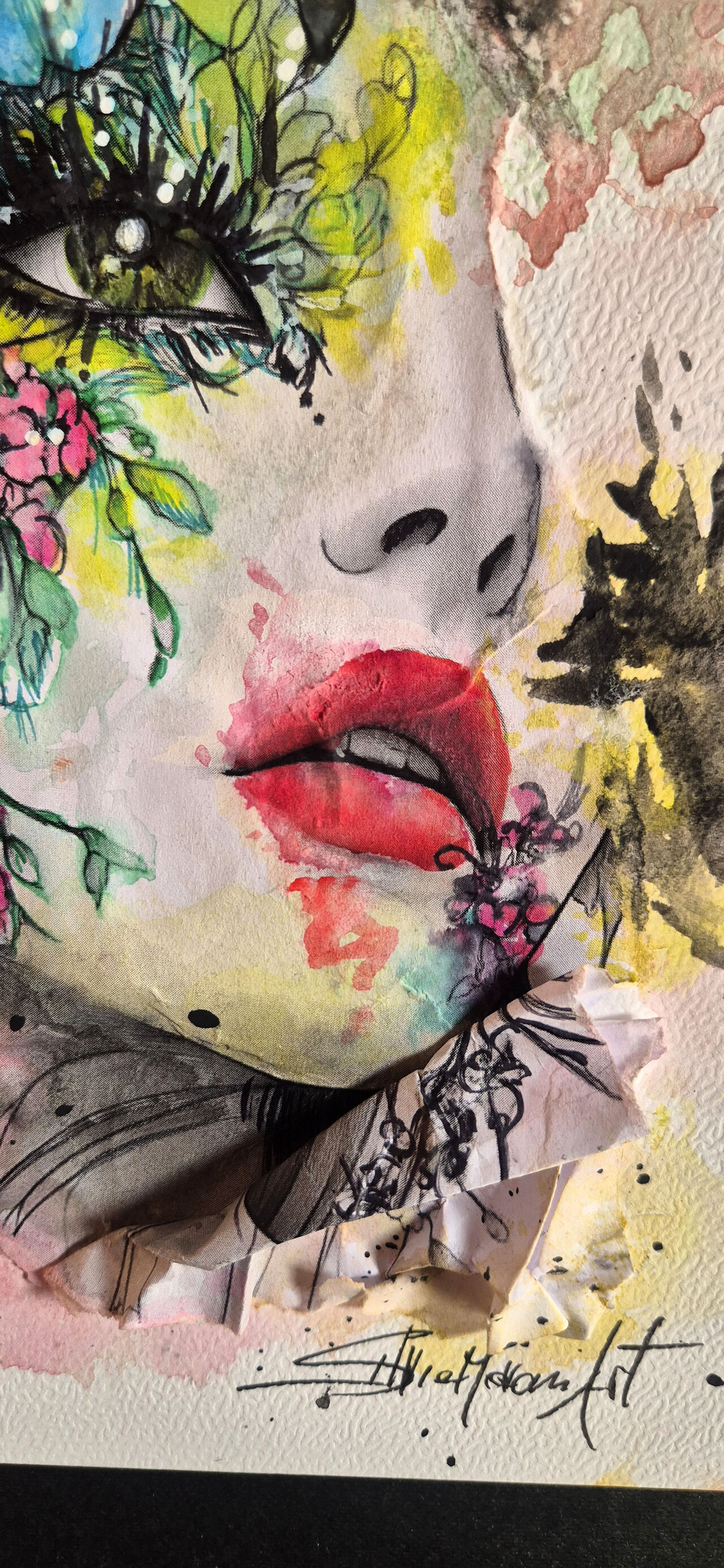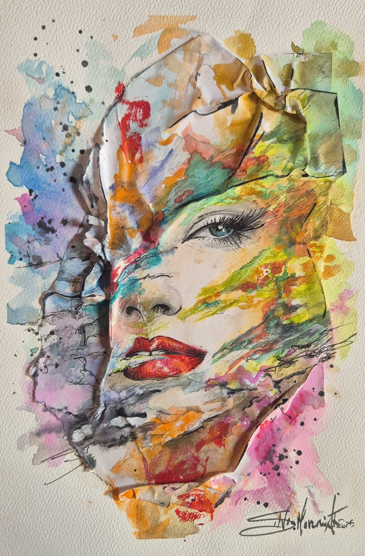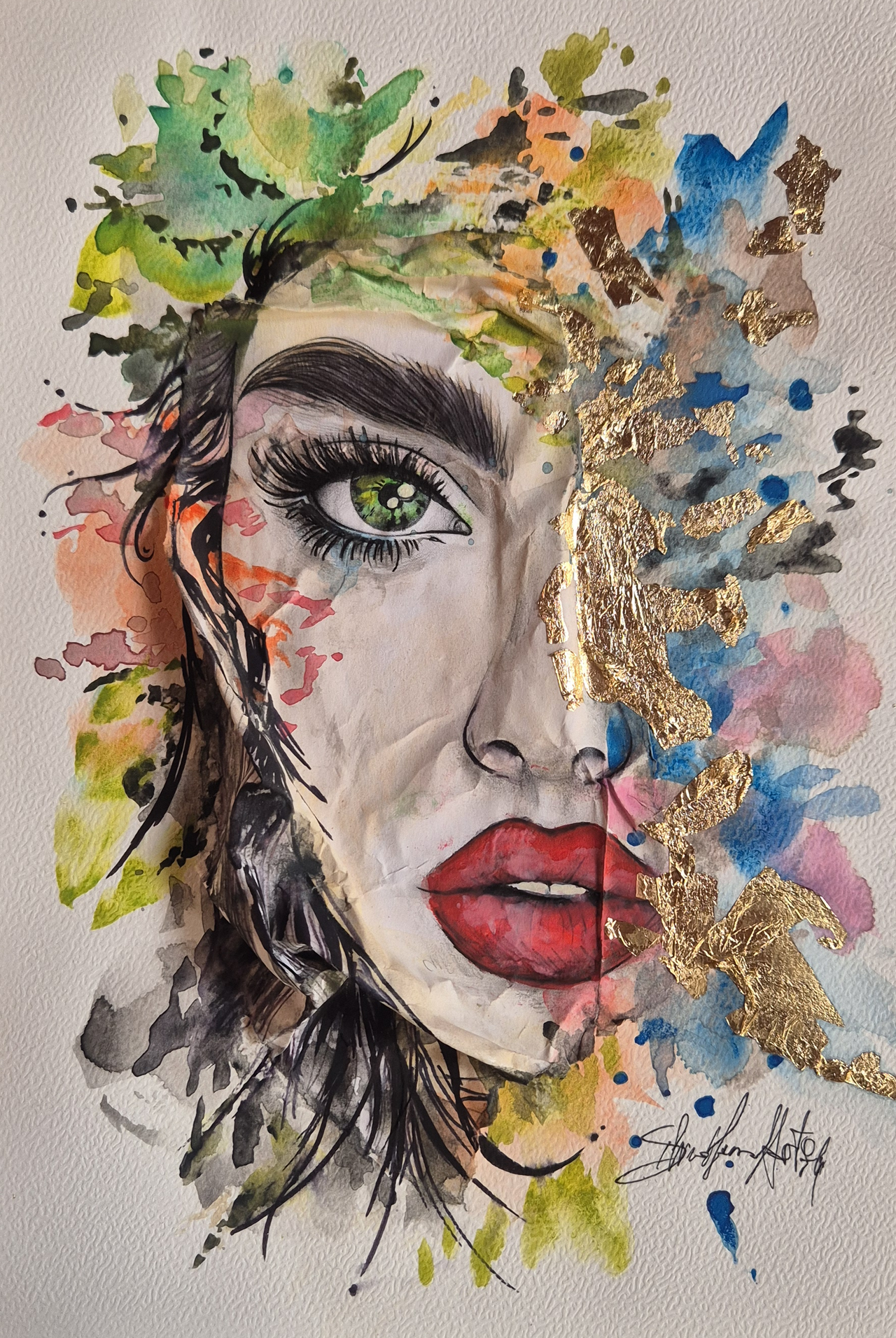 Contorni del volto, soprattutto occhi, sopracciglia e labbra, definiti con linee nette con inchiostri e fineliner che danno struttura e carattere al volto, creando un contrasto forte con le parti più morbide. Effetti tridimensionali, quasi scultorei, che catturano la luce. Pennellate libere, gestuali, lasciate volutamente “aperte”, come se il colore respirasse intorno al volto.