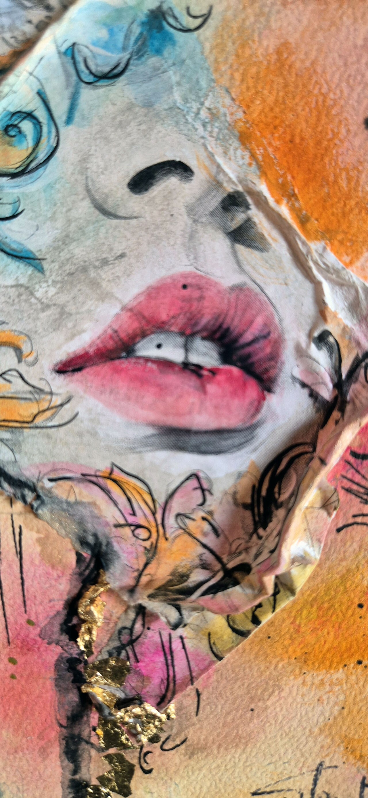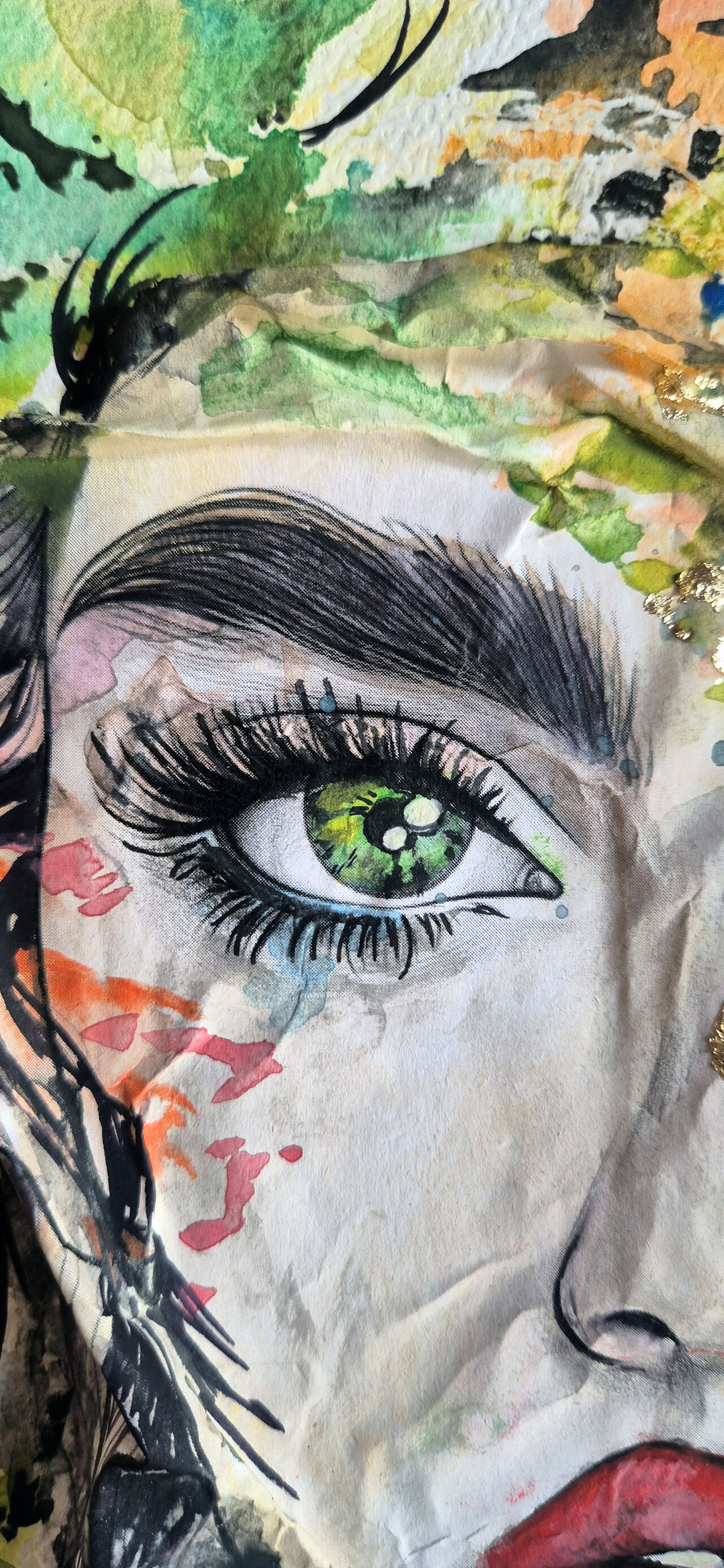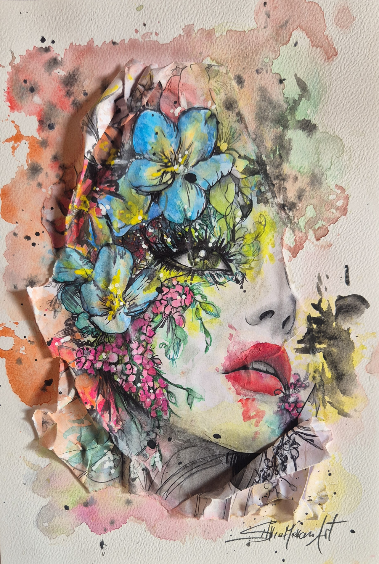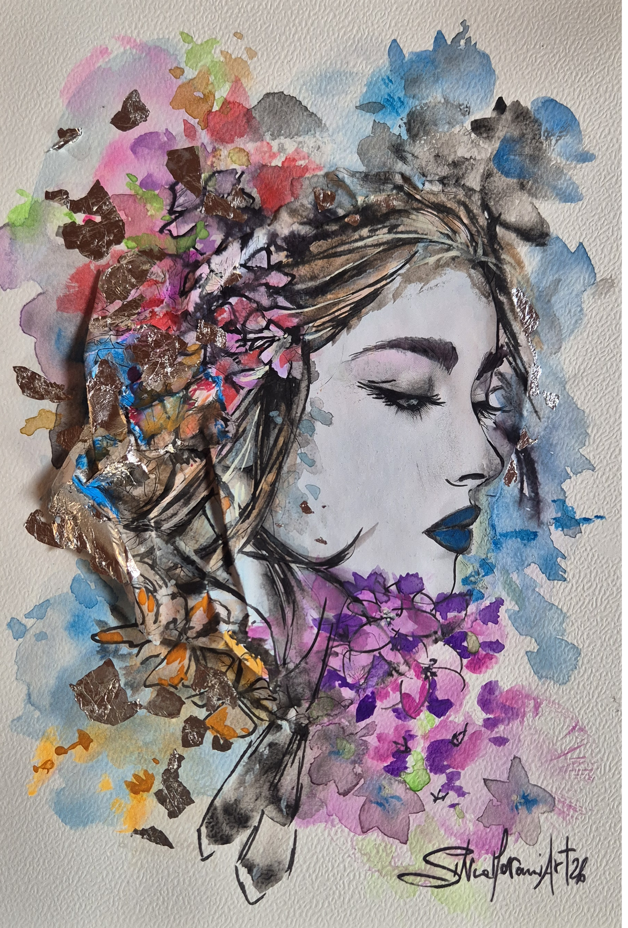 Contorni del volto, soprattutto occhi, sopracciglia e labbra, definiti con linee nette con inchiostri e fineliner che danno struttura e carattere al volto, creando un contrasto forte con le parti più morbide. Effetti tridimensionali, quasi scultorei, che catturano la luce. Pennellate libere, gestuali, lasciate volutamente “aperte”, come se il colore respirasse intorno al volto.