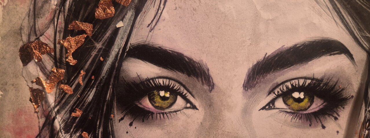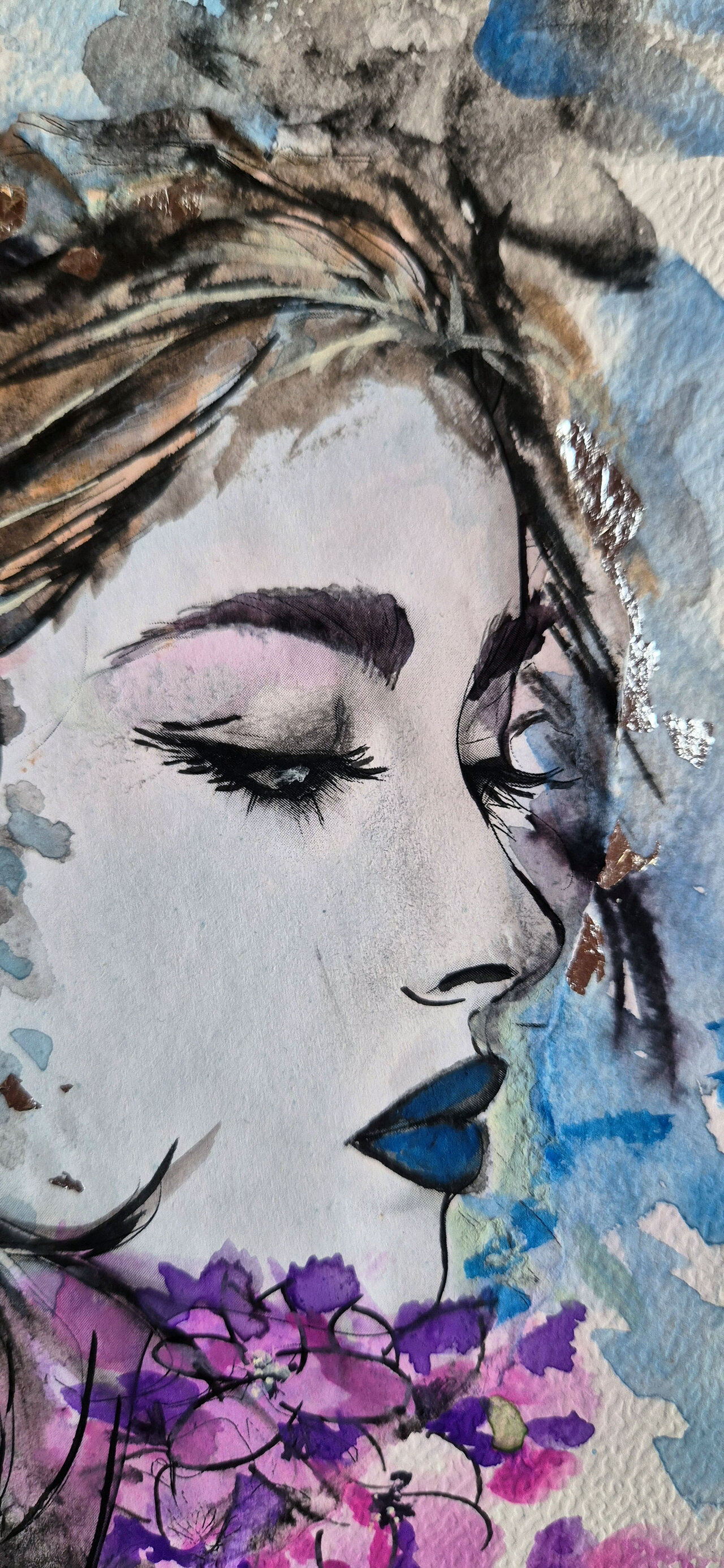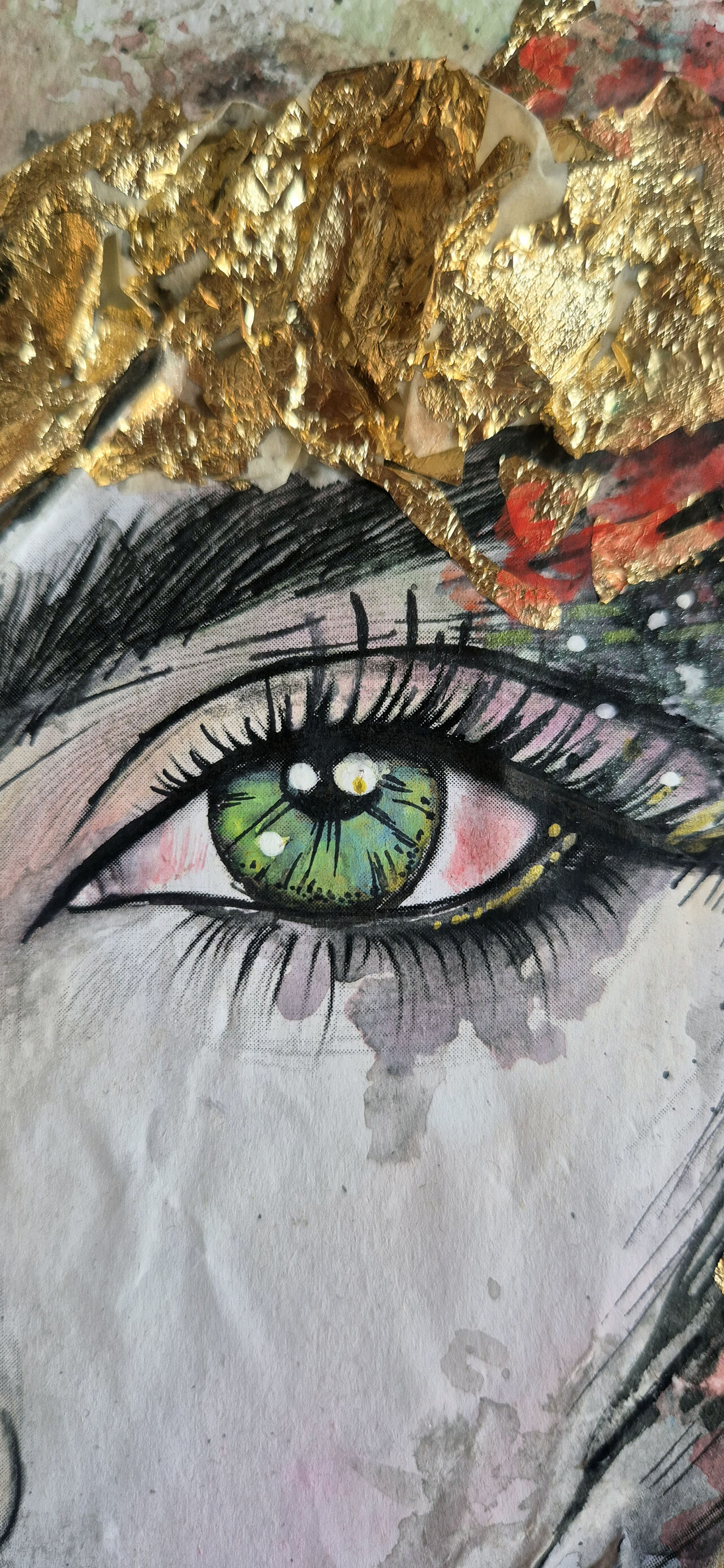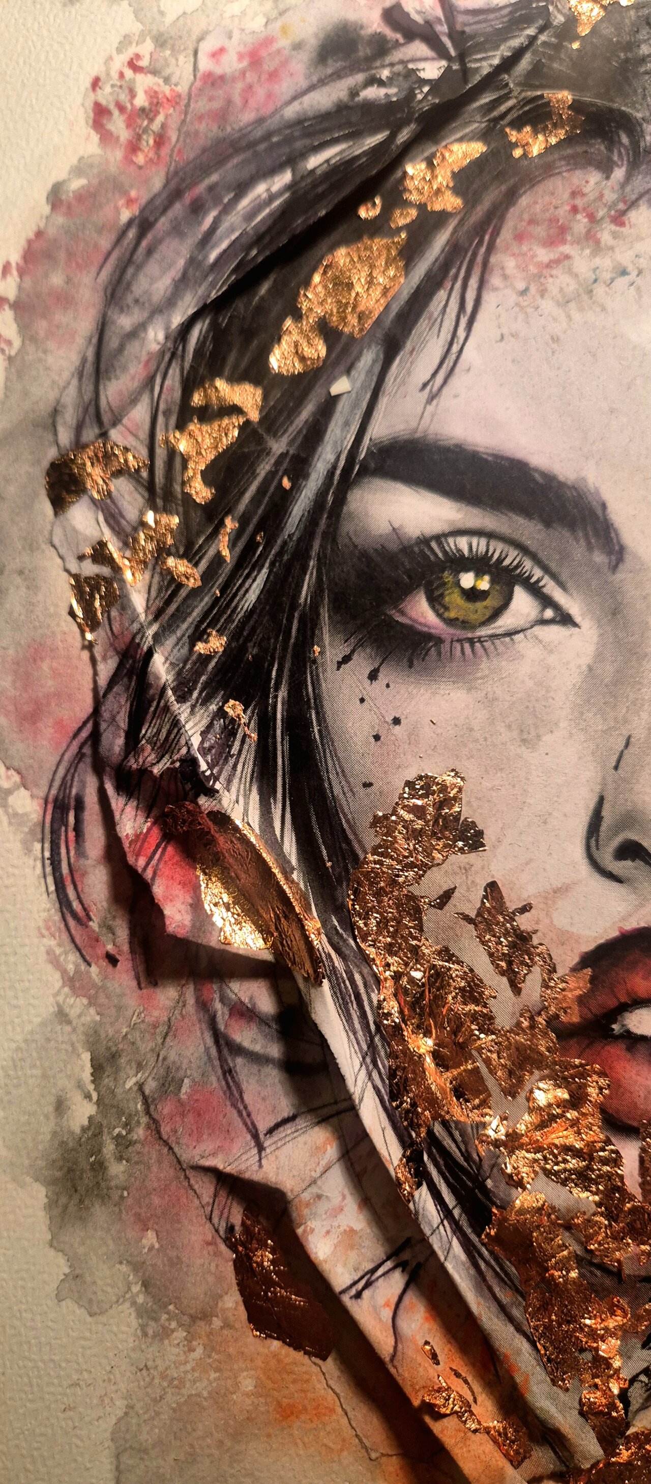 Contorni del volto, soprattutto occhi, sopracciglia e labbra, definiti con linee nette con inchiostri e fineliner che danno struttura e carattere al volto, creando un contrasto forte con le parti più morbide. Effetti tridimensionali, quasi scultorei, che catturano la luce. Pennellate libere, gestuali, lasciate volutamente “aperte”, come se il colore respirasse intorno al volto.